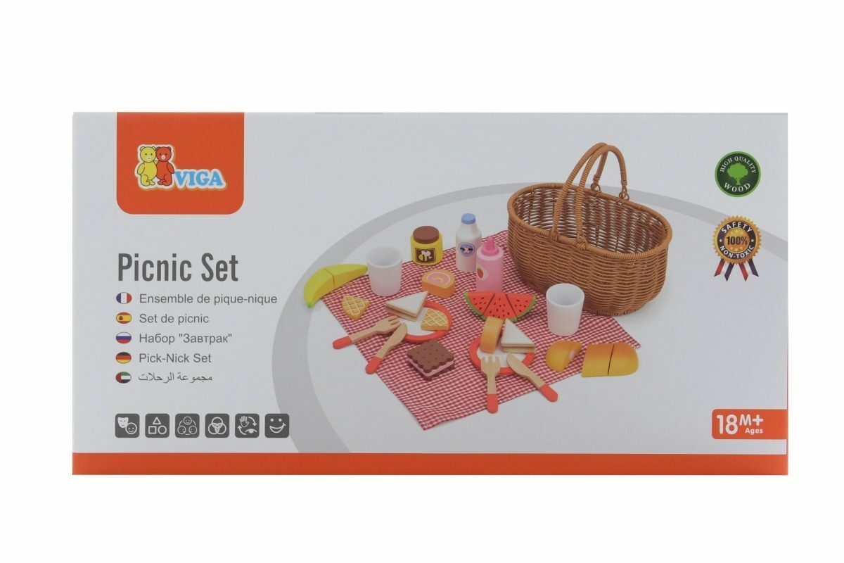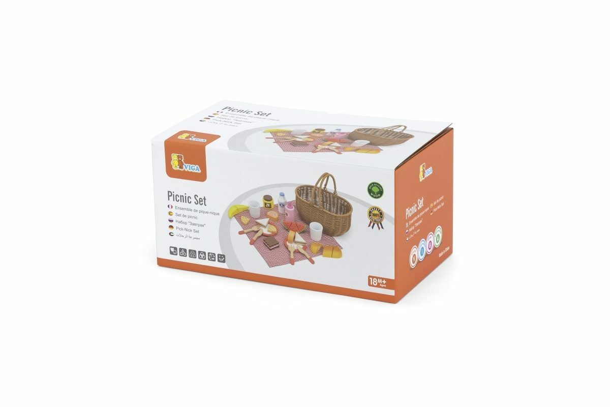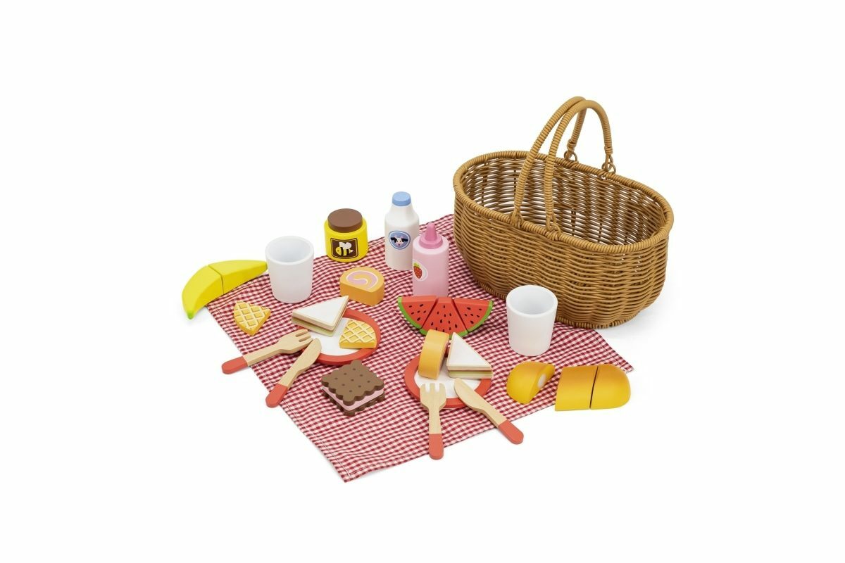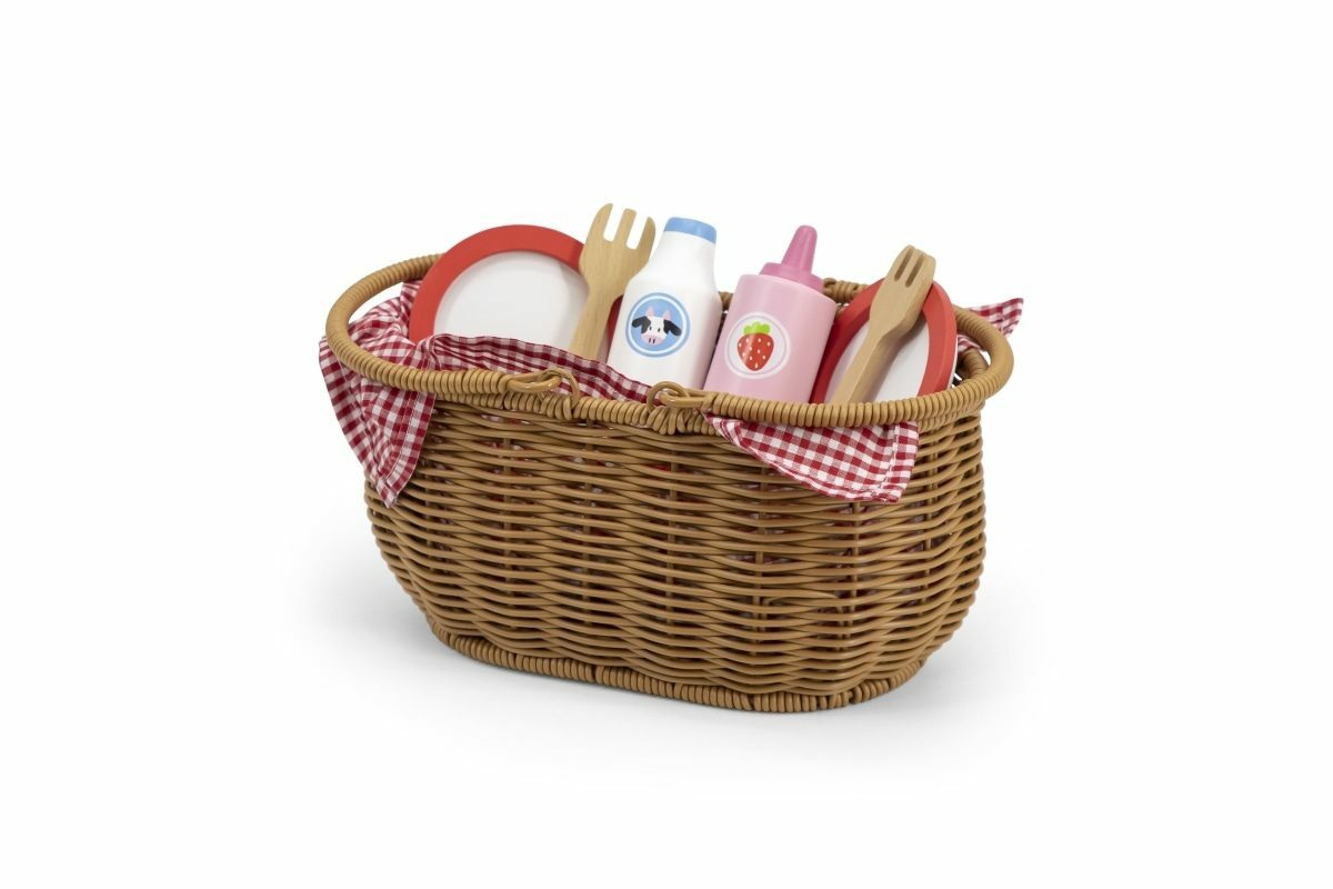 Krásný koš z umělého rákosu je vyplněný dřevěnou sadou doplňků a kostkovanou látkou. Díky bytelným madlům si vaše dítě snadno vezme celou sadu s sebou, kamkoli půjde. Sada se skládá z 30 prvků. Rozměr košíku cca 25 x 23,5 x 14,5 cm. Rozměr balení cca 28 x 14 x 16 cm. Věk...