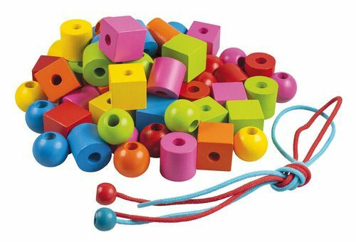 Dřevěné maxiperle různých tvarů o průměru 20 mm se šňůrkou na navlékání s předlohami. Výrobek splňuje požadavky EU na bezpečnost hraček a je vhodný pro děti od 3 let.