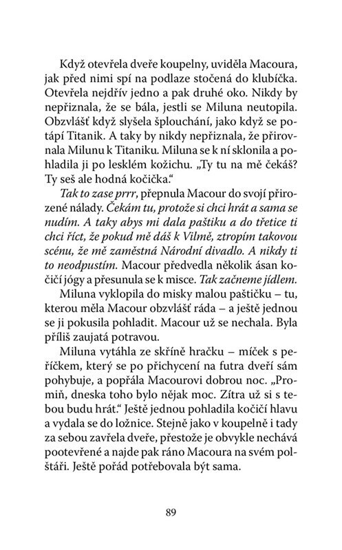 Co chybí ženě s úspěšnou kariérou a neúspěšnými vztahy? Kočka! Macour z útulku není ale ledajaká kočka. Intrikuje, manipuluje, neustále Miluně žvaní do života a snaží se ze své paničky udělat… prostě kočku. Zatočí se všemi hraboši, najde Miluně toho pravého a naučí ji konečně přemýšlet kočičím...