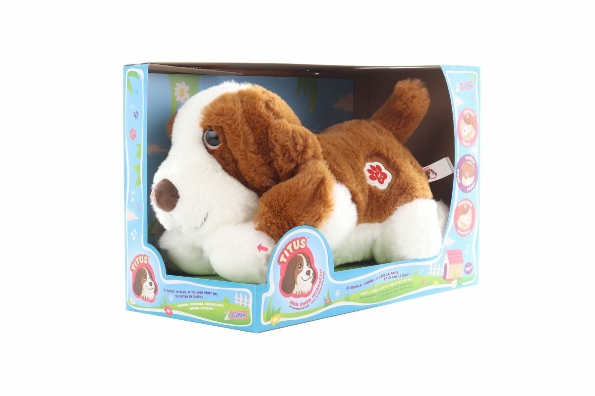 Plyšový interaktivní pejsek. Po těle má několik tlačítek, po jejichž zmačknutí se hýbe a vydává zvuky. Napájení na 3 AA baterie, které jsou součástí balení. Rozměry balení cca 31x17x22 cm. Velikost pejska 32 cm. Věk 18m+