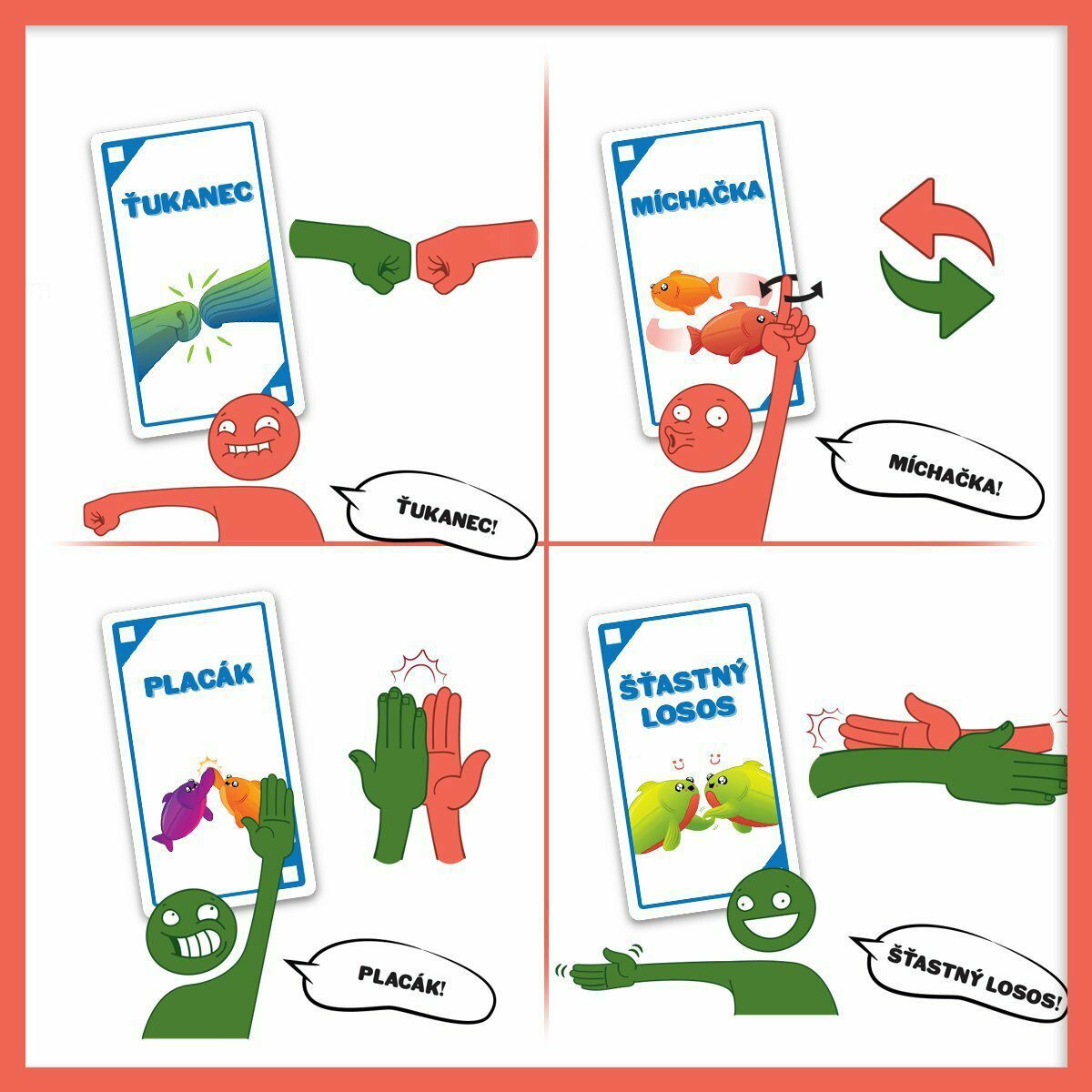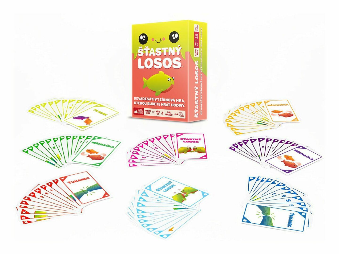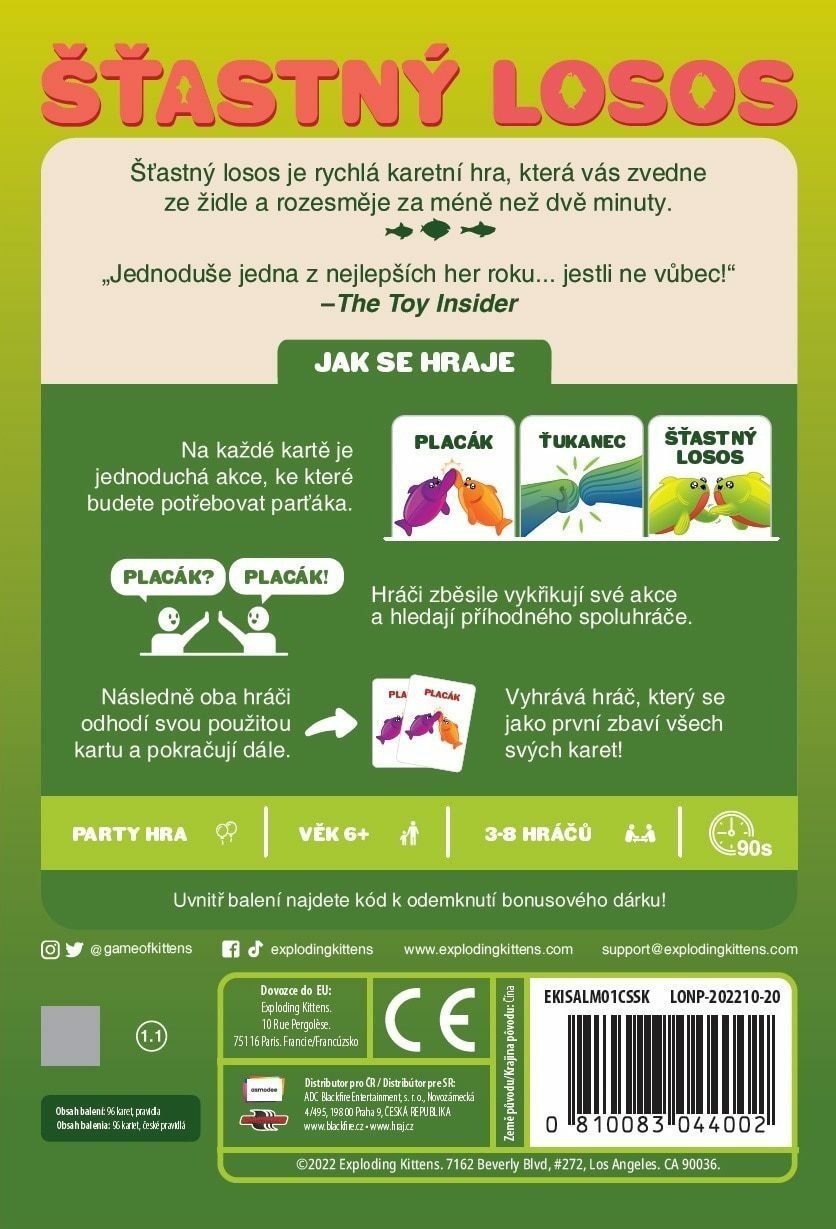 Šťastný losos je rychlá, pohybová a HLASITÁ hra, která vás rozesměje za méně než dvě minuty. Takže vykliďte prostor, zbavte se židlí a pokud vám srdeční tep vyskočí na 120 úderů za minutu, nejspíš to děláte dobře. Jak na hru? Na každé kartě je jednoduchá akce, ke které budete potřebovat parťáka....