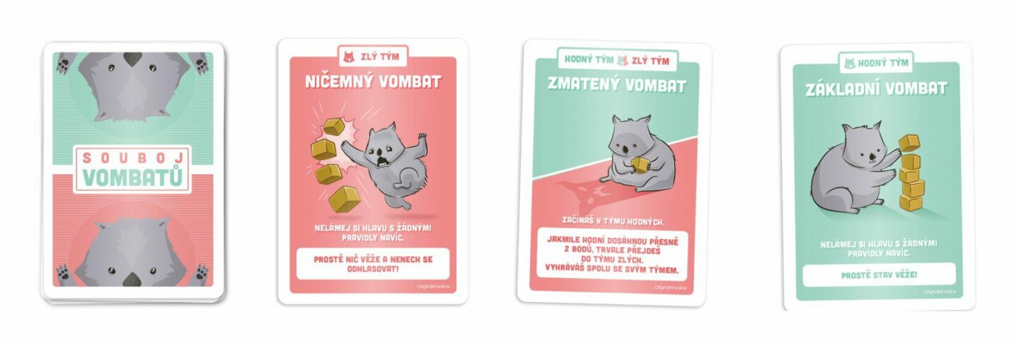 Přichází totální vombatí souboj! Buďte součástí vombatího týmu, kterému se v průběhu několika kol podaří jako prvnímu získat 3 body buď za stavění, nebo boření třech vombatích věží. Dejte však pozor, aby vás ostatní neodhlasovali ještě před koncem hry! Jak to funguje? 1. Každý hráč má tajnou...