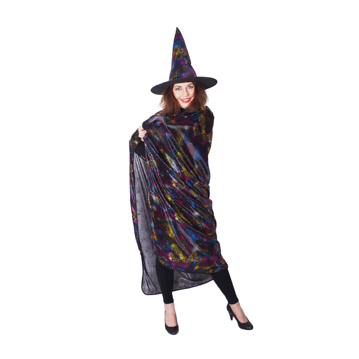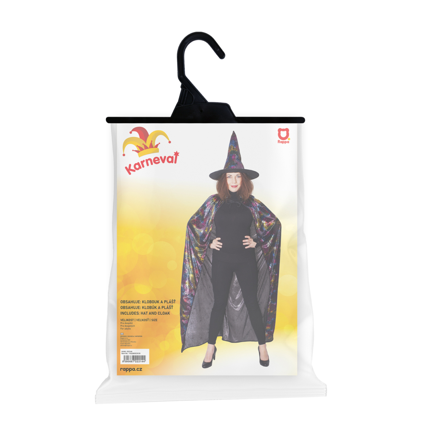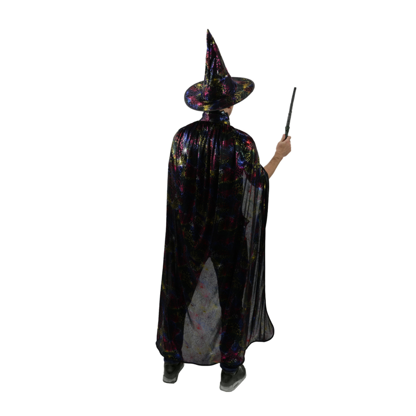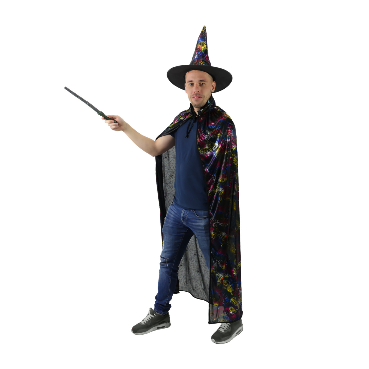 Úžasný černý plášť pro všechny čaroděje a čarodějnice! Plášť je určen pro dospělé a je dekorován potiskem barevných pavučin. Součástí kostýmu je perfektně sladěný klobouk. Plášť je dlouhý cca 140 cm. Ideální na karneval nebo halloweenskou párty. Hůlka není součástí...