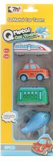 Sada kovových dopravních prostředků. Balení obsahuje 4 dopravní prostředky o velikosti cca 6,5 cm. Rozměry balení cca 11 x 32 x 4,5 cm. Věk 18m+