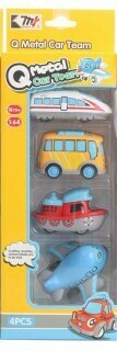 Sada kovových dopravních prostředků. Balení obsahuje 4 dopravní prostředky o velikosti cca 6,5 cm. Rozměry balení cca 11 x 32 x 4,5 cm. Věk 18m+